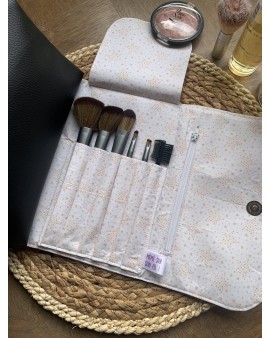 6 compartiments pour ranger les pinceaux et crayons (3 pour gros pinceaux, 3 pour pinceaux ou crayons assez fin), d'un rabat sur ces pinceaux/crayons afin qu'ils ne se sauvent pas lors du transport, d'une poche zip pour ranger du rouge à lèvre, des bijoux, ...